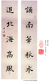 - Чжан Лун#янь. Парные настенные свитки, 1998 г.; почерк кай#шу; 33х69,3 см; собрание автора, Тайвань [Лунгу, Т. 1. С. 146]