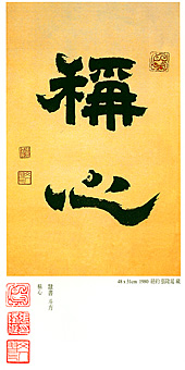 - Чжан Лун#янь. Чэнсинь («Удовлетворенное сердце»), 1980 г.; альбомный лист; почерк ли#шу; бумага, тушь, 48х31 см; собрание автора, Тайвань [Лунгу, Т. 1. С. 79]В верхнем правом углу краснознаковая печать с изображением феникса. В нижнем левом углу белознаковая печать Чжан Лун#янь инь («Печать Чжан Лун#яня»); ниже – краснознаковая печать Вэнь#жэнь си ци («Упражнения интелектуала»).