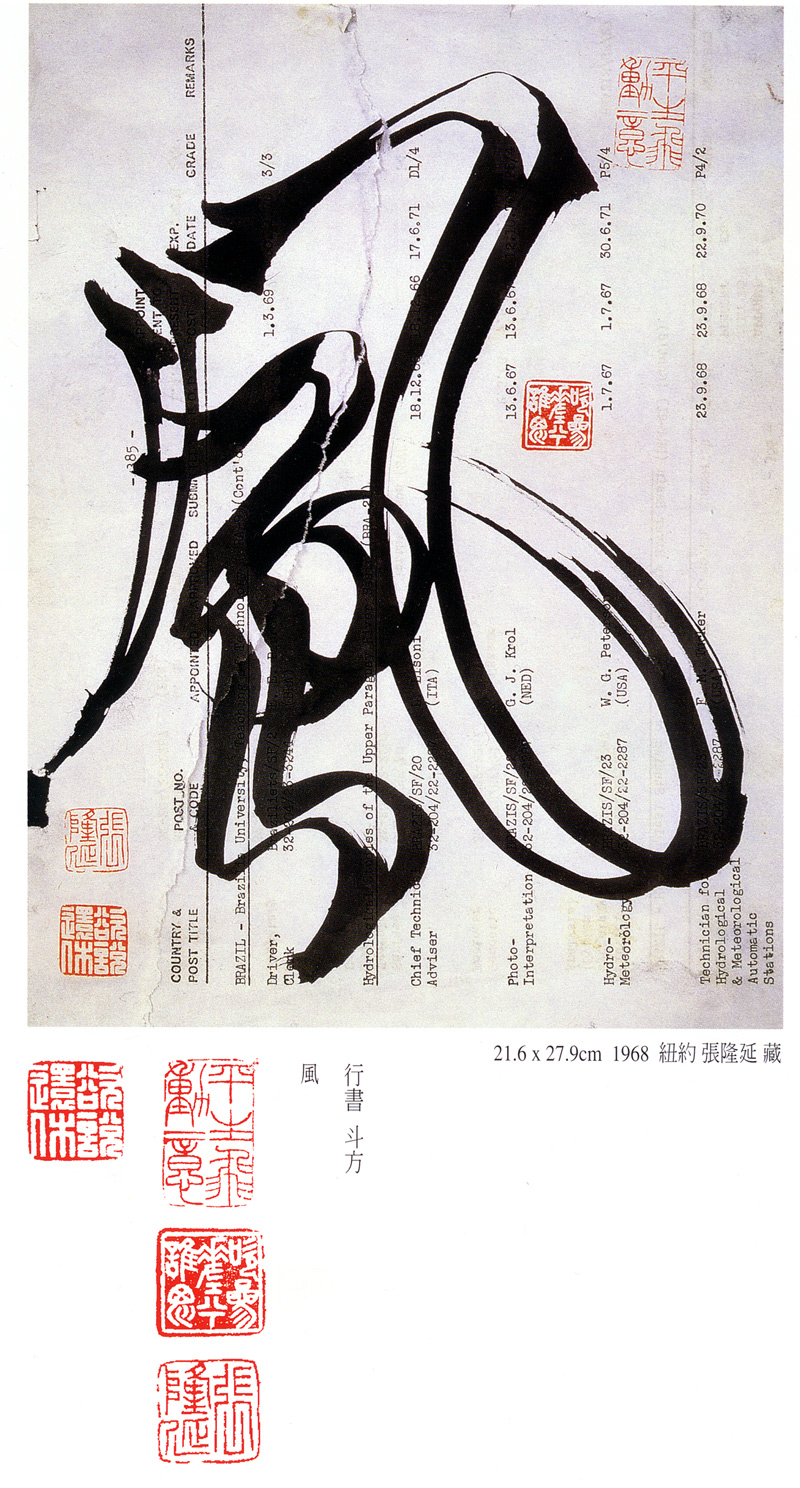 Чжан Лун#янь. Фэн («Ветер»), 1968 г.; почерк син#шу; писчая бумага, тушь, 21,6х27,9 см; собрание семьи каллиграфа, Тайвань [Лунгу, Т. 1. С. 48]